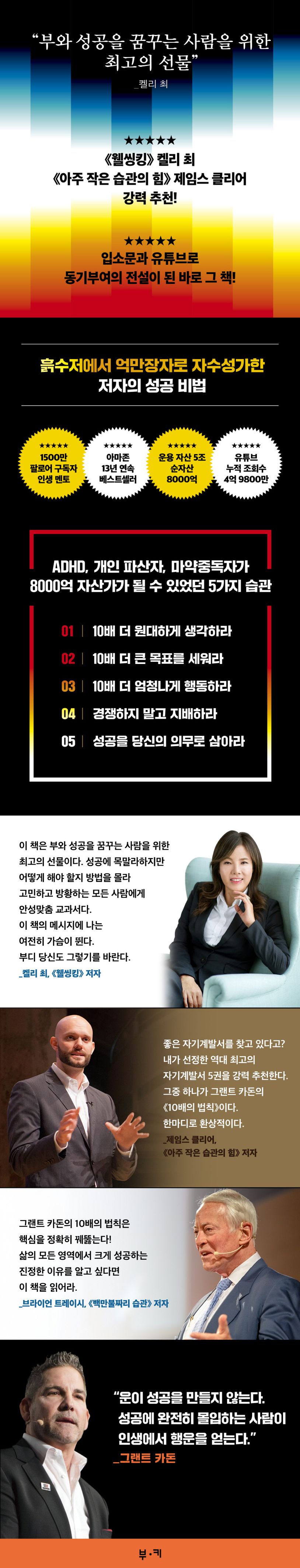 성공과 부를 꿈꾸는 사람들 사이에 입에서 입으로 전해져 동기부여의 전설이 되어버린 책, 그랜트 카돈의 《10배의 법칙》이 마침내 국내 출간 50쇄를 돌파했다. 아마존에서 13년 넘게 베스트셀러에 올라 있는 이 책은 전 세계의 수많은 독자가 주저 없이 자신의 “인생책”으로 인증하는 성공 비법서다. 국내에서는 유튜브 영상과 바이럴로 화제 몰이를 하면서 구간 가격이 최소 10배에서 최대 30배까지 호가하며 없어서 못 구하는 책으로 불리기도 했다.