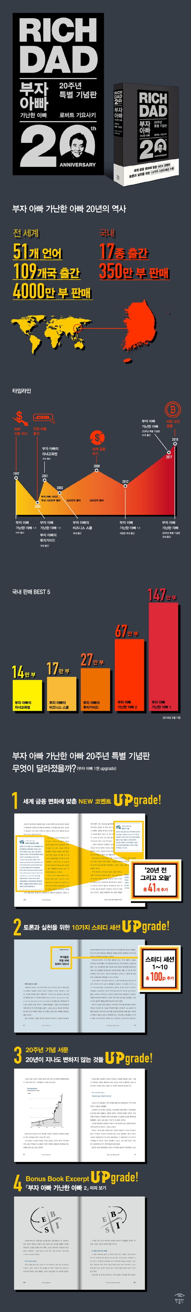 기존 《부자 아빠 가난한 아빠》 제1권에는 없던 41개의 ‘20년 전 그리고 오늘’과 10가지 ‘스터디 세션’ 등 총 500매 분량의 새로운 내용을 추가한 『부자 아빠 가난한 아빠(20주년 특별 기념판)』. 돈에 대한 선입관을 깨뜨리는 파격적인 내용과 세월이 흘러도 흔들리지 않는 기준이 되어 줄 투자의 원칙들을 담은 책이다.