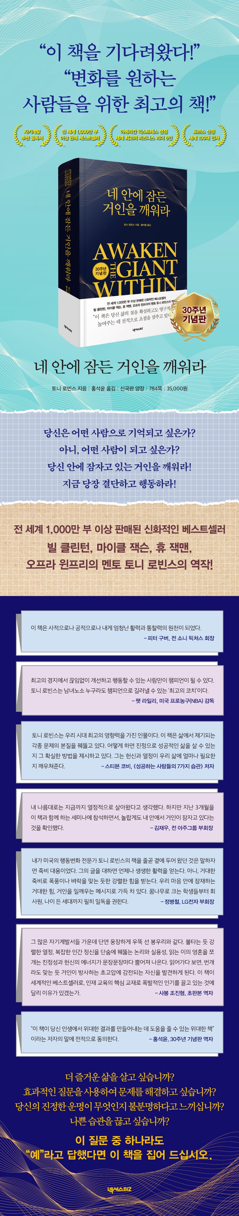 《네 안에 잠든 거인을 깨워라》는 로빈스의 자기계발 무기고에 들어갈 또 다른 심오하고 강력한 도구다. 이 책은 사적으로나 공적으로나 내게 엄청난 활력과 통찰력의 원천이 되었다.