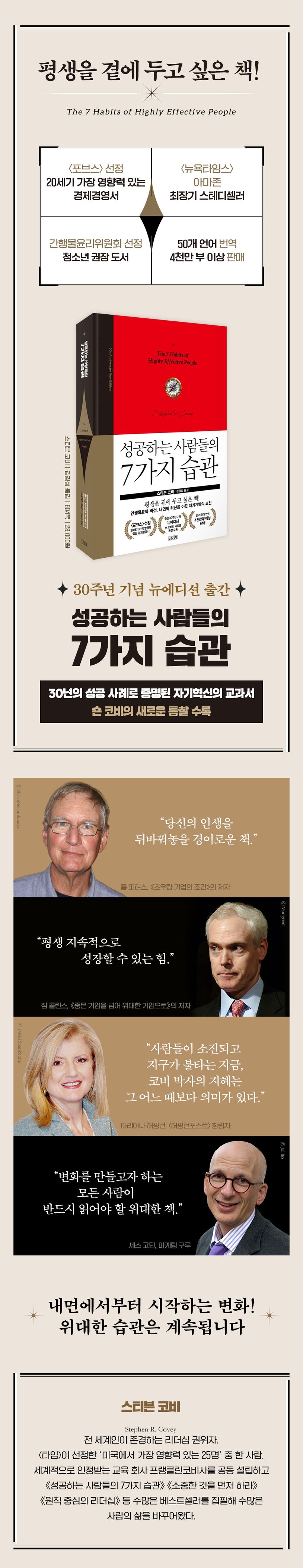 평생을 곁에 두고 싶은 책! 세계 4천만 독자, 국내 400만 독자, 세계 1만여 기업과 조직이 앞다투어 읽으며 삶을 변화시킨 자기계발서 《성공하는 사람들의 7가지 습관》. 원칙 중심의 삶과 내면에서 시작하는 패러다임 변화를 제시하며 돌풍을 일으킨 불멸의 자기계발서가 출간 30주년을 맞이해 새로운 표지와 편집의 뉴에디션이 출간되었다. 누구보다 7가지 습관에 대해 많이 연구해온 숀 코비의 해설을 추가했다. 하루의 습관에서 평생의 목표와 태도까지, ‘7가지 습관’이 당신에게도 변함없는 삶의 좌표를 밝혀줄 것이다.