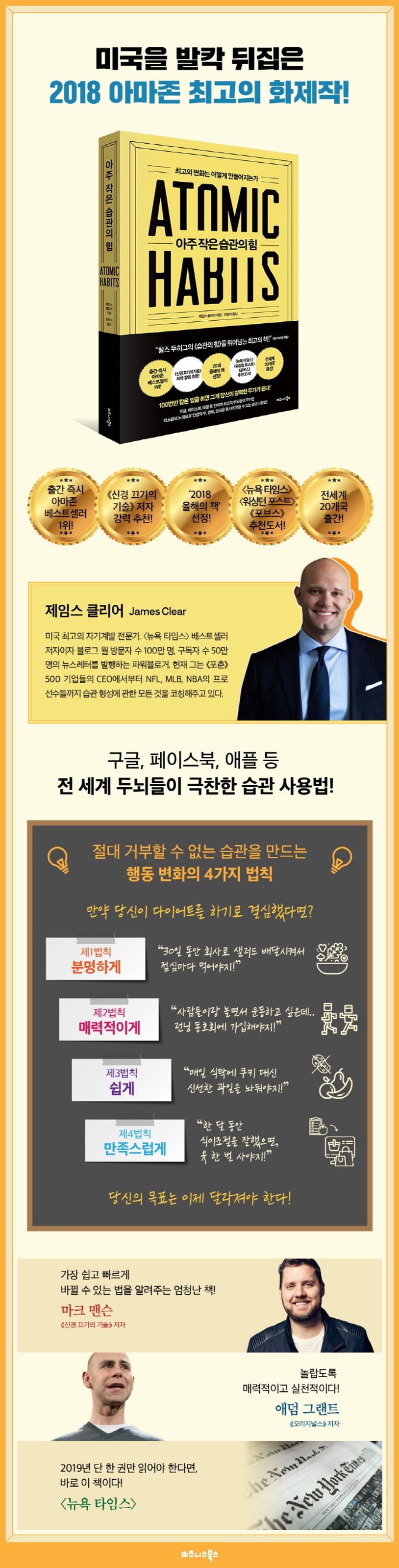 금연, 다이어트에서부터 비즈니스에서 탁월한 성과를 이뤄내기까지 누구나 쉽게 이해하고 적용할 수 있는 방식으로 습관을 세우고 삶을 변화시키는 과학적인 방법을 설명한다. 저자는 사소하고 별것 아닌 일이라도 몇 년 동안 꾸준히 해나가면 정말로 놀랄 만한 결과가 나타난다고 이야기하며 이 책에서 제안하는 방법으로 매일 조금씩 좋은 습관을 만든다면 무엇을 결심하든 원하는 것을 얻을 수 있다는 용기와 희망을 전한다.