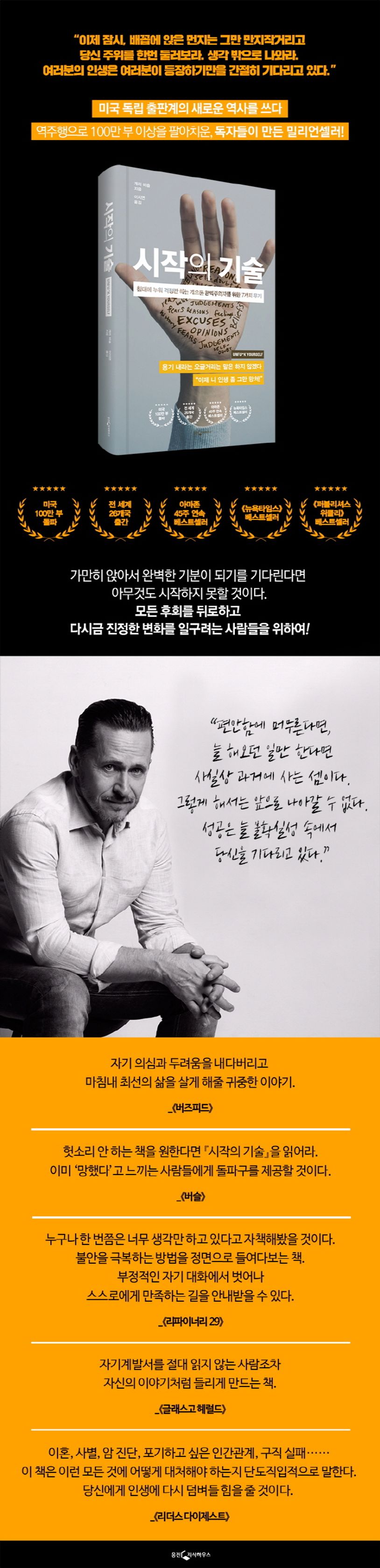 매일 핑계를 대며 하루하루를 수습하기 급급한 사람들, 아직 자신은 준비되지 않았다며 자기를 합리화하고 선택을 보류하며 어떤 일도 시작하지 못하는 사람들, 침대에 누워서 머릿속으로 걱정만 하다 핸드폰을 보며 잠이 드는 사람들, 그러면서도 이렇게 사는 게 지긋지긋한 사람들…… 이렇듯 인생을 자꾸 나중으로 미루는 우리에게 『시작의 기술』은 더 이상 숨을 틈을 주지 않는 따귀 한 대와 같다. 이 책은 처음엔 독립 출판으로 출간되었다가, 독자들 사이에 입소문이 퍼지면서 이내 열성적인 팬들을 만들어냈다. 뜨거운 인기에 힘입어 세계적인 출판사 하퍼콜린스에서 재출간되었으며, 미국에서만 100만 부 이상 판매되었다. 출판사에서 대대적으로 밀어 많이 팔았거나 저자가 워낙 유명해서 기존 독자층 있던 책이 아니라 말 그대로 독자들의 극찬이 밀리언셀러로 끌어올린 셈이다.