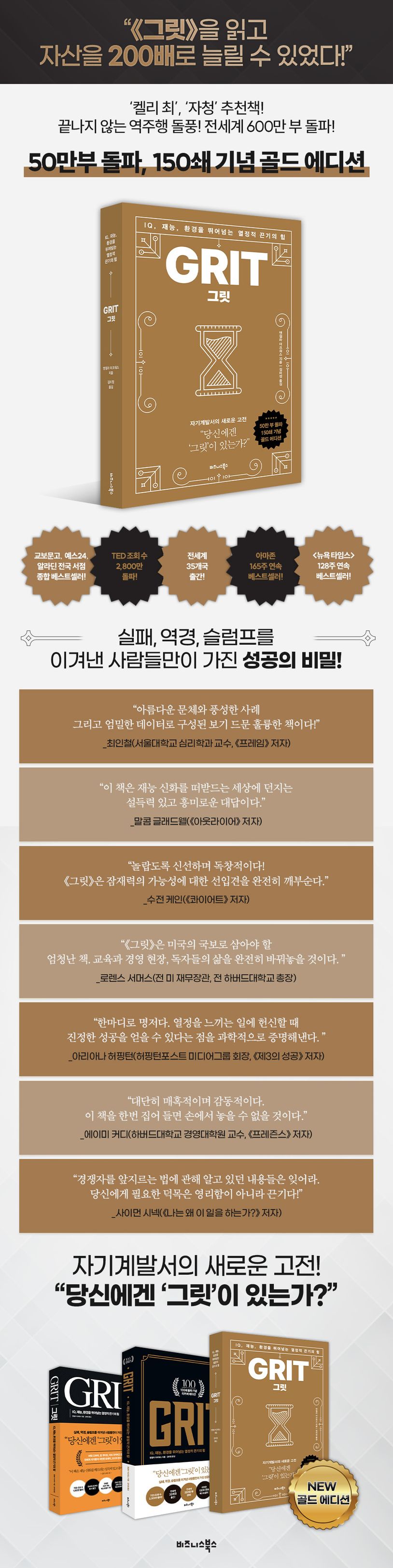 2016년 출간 즉시 아마존 베스트셀러 1위에 오르며 교육, 산업, 방송할 것 없이 전세계적으로 신드롬을 일으킨 책 《그릿》이 국내 50만 부 돌파, 150쇄를 기념한 골드 에디션으로 다시 우리를 찾아왔다. 이번 리커버는 고급스러운 하드커버로 소장 가치를 높였다. 이 책이 끊임없이 역주행을 하며 전세계 600만 독자들에게 사랑을 받는 이유는 성공에 있어 가장 중요한 태도이지만 오늘날 그 의미가 퇴색되어버린 열정, 노력, 끈기의 가치를 우리에게 다시 상기시켜주기 때문일 것이다. 최근 새로운 시대의 성공 비밀을 알고 싶다면 이 책을 펼쳐라! 자신만의 성공을 꿈꾸는 많은 이들에게, 아이의 성취감을 길러주고 싶은 부모들에게, 도전을 멈추지 않는 기업가들에게 용기와 희망의 메시지를 전해줄 것이다.