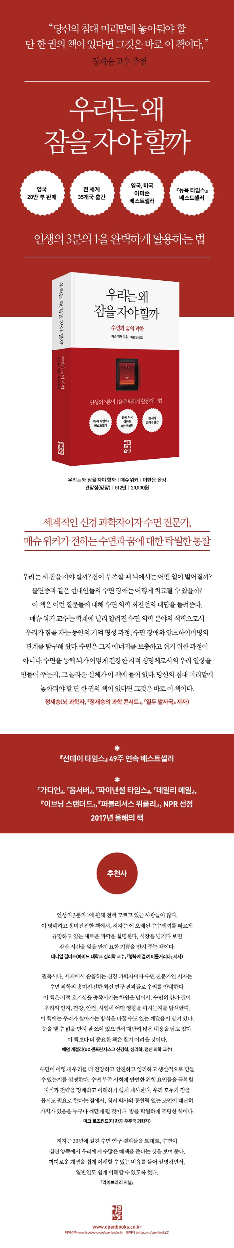 수면 과학은 지난 20년 동안 과학적 발견이 폭발적으로 이루어지면서 새롭게 규명되기 시작했다. 그리고 저자는 이 책을 통해 "우리는 잠을 자야 한다"고 말하며, 왜 그래야만 하는지 그 이유까지도 친절하게 설명해준다. 심지어 수면 부족을 '느린 형태의 자기 안락사'라고 표현하면서까지 수면의 중요성을 강조한 것이다. 저자의 수면 처방은 우리 일상을 새롭게 바꿔주며 건강한 삶을 위한 발판이 되어준다.