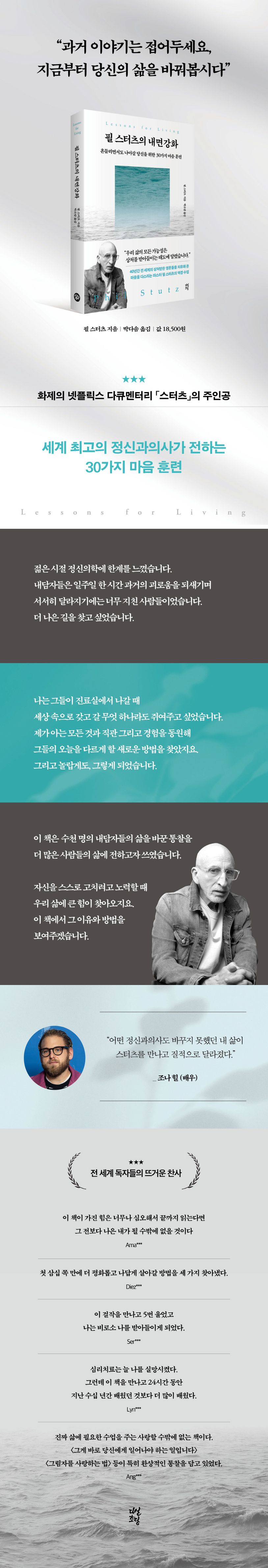 성인이 되고 시간이 지날수록 우리를 당황하게 만드는 사실이 하나 있다. 어른이 되었다는, 이제 세상의 무게를 견뎌낼 수 있다는 자신감이 좀처럼 찾아오지 않는다는 것이다. 세월이 그 자체로 사람을 강하게 만들어주지 않는다. 오히려 겪어보지 않아 품었던 패기를 잃어버리고 더 쉽게 상처받고 더 큰 두려움을 품은 나를 발견할지도 모른다. 세상에 대한 내성을 품은 단단하고 고유한 존재로 살아가고 싶으나 일상만으로 버거웠다면 『필 스터츠의 내면강화』는 중요한 변화의 계기를 열어줄 것이다.